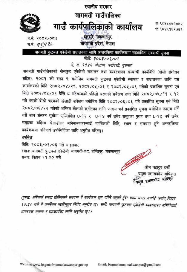 बागमती फुटबल एकेडेमी सञ्चालनका लागि अन्तरक्रिया कार्यक्रम सहभागिता सम्बन्धी सुचना