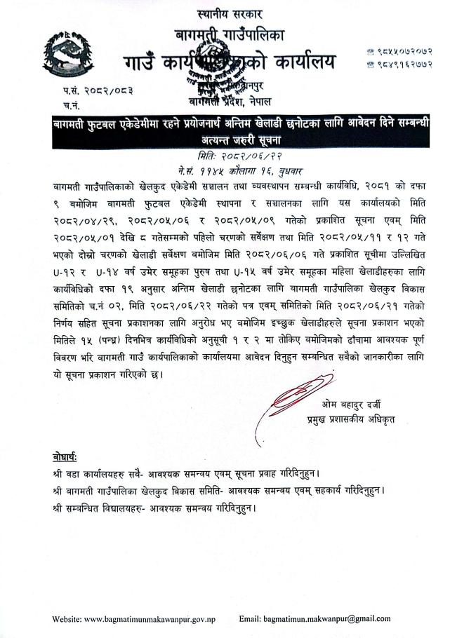 बागमती फुटबल एकेडेमीमा रहने प्रयोजनार्थ अन्तिम खेलाडी छनोटका लागि आवेदन दिने सम्बन्धी अत्यन्त जरुरी सूचना