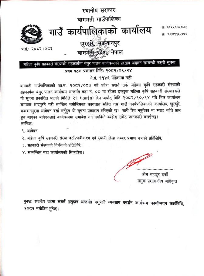महिला कृषि सहकारी संस्थाको सहकार्यमा बंगुर पालन कार्यक्रमको प्रस्ताव आव्हान सम्बन्धी जरुरी सूचना (प्रथम प्रक प्रकाशित: २०८२/०९/२४))