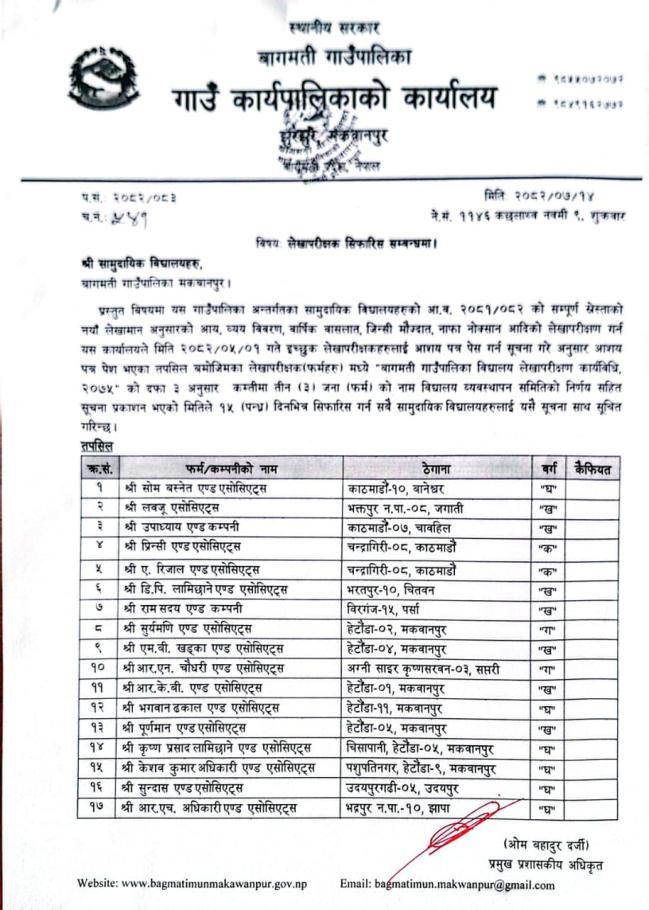 लेखापरिक्षक सिफारिस सम्बन्धमा (सामुदायिक बिद्यालयहरु)