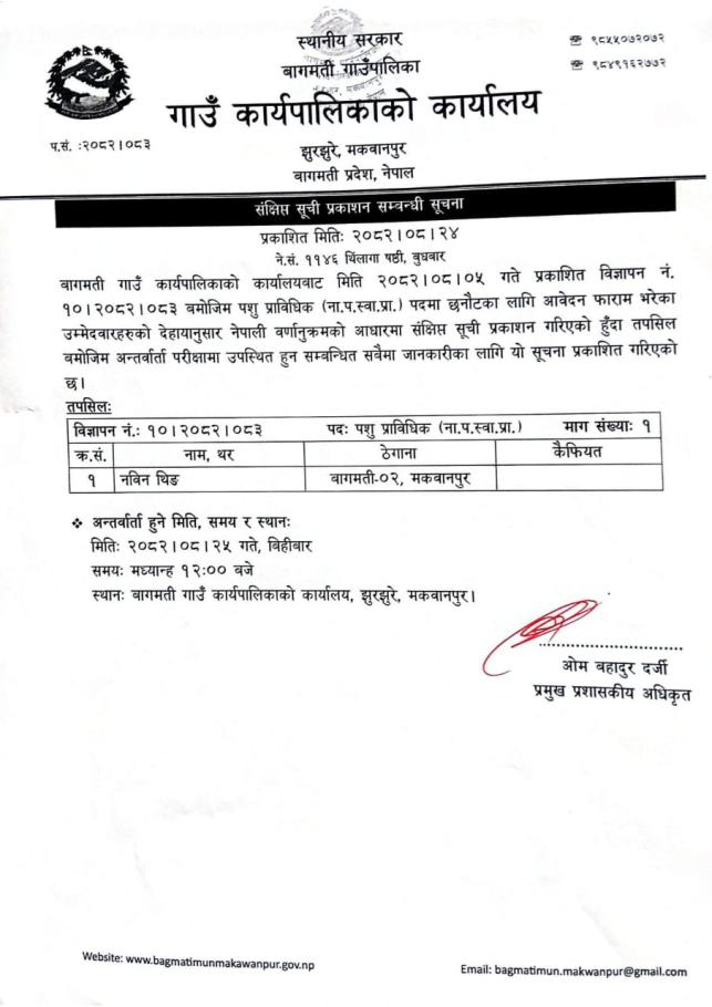 सन्क्षिप्त सुची प्रकाशन सम्बन्धी सूचना (पशु प्राविधिक)