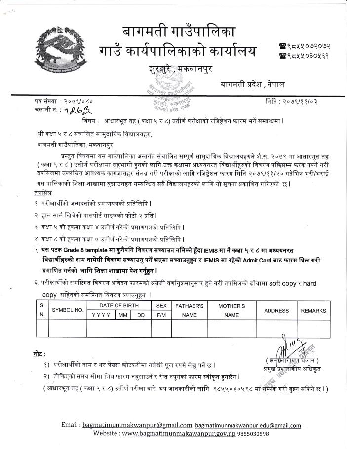 आधारभूत तअह (कक्षा ५ र ८) उत्तीर्ण परीक्षाको रजिष्ट्रेशन फारम भर्ने सम्बन्धी सूचना।।