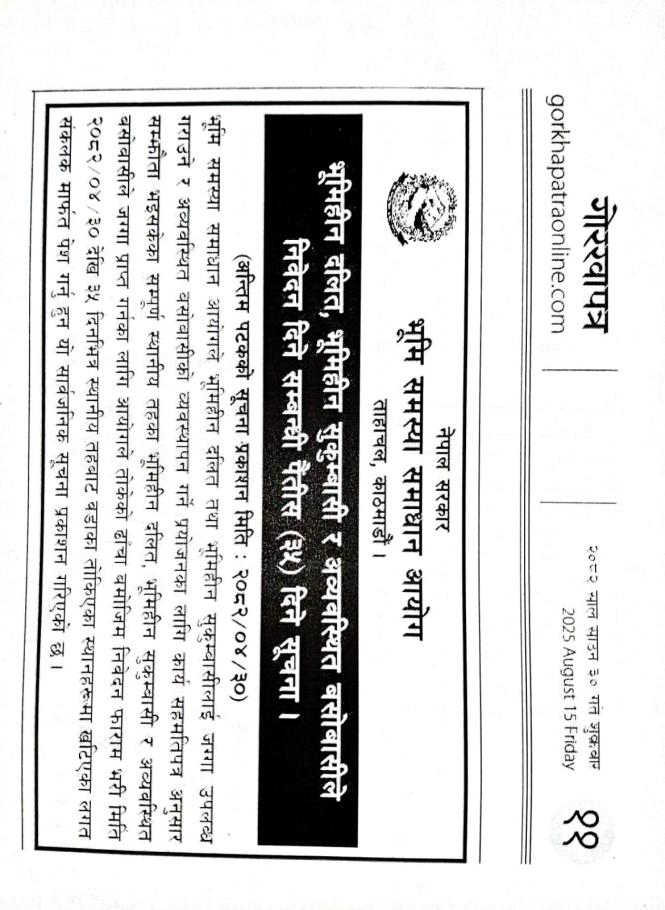 » छुटफुट हुन गएका भूमिहीन दलित, भूमिहीन सुकुम्बासी तथा अव्यवस्थित बसोबासीहरुको पुन: लगत संकलन गर्न ३५ दिने सार्वजनिक सूचना