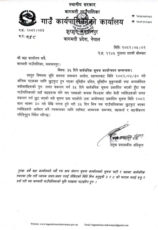छुटफुट हुन गएका भूमिहीन दलित, भूमिहीन सुकुम्बासी तथा अव्यवस्थित बसोबासीहरुको पुन: लगत संकलन गर्न ३५ दिने सार्वजनिक सूचना