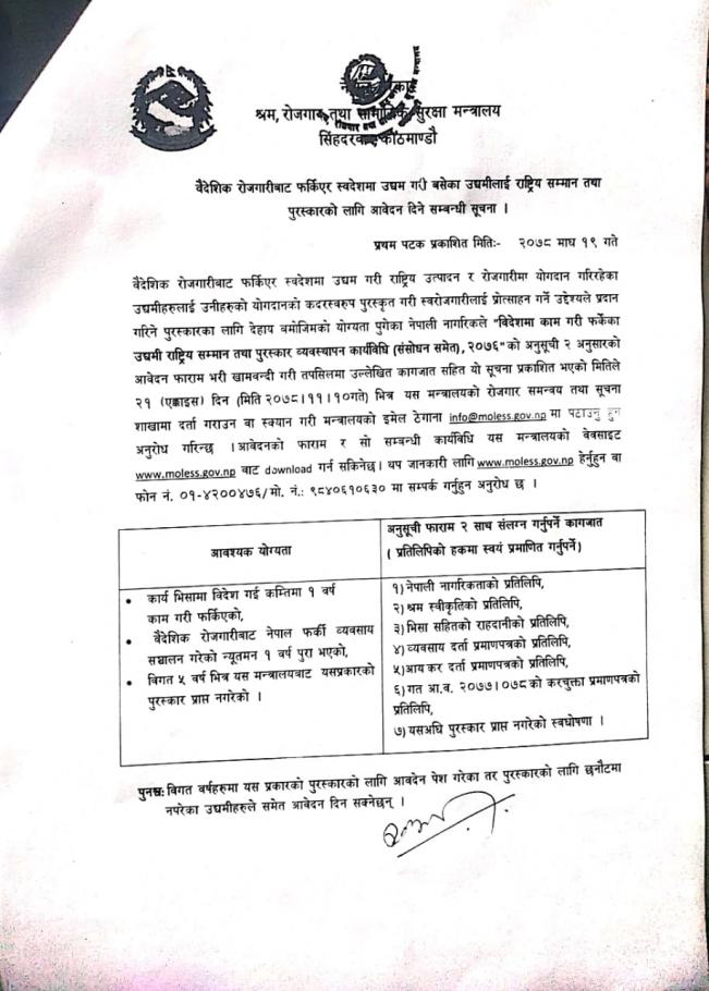 » पुरस्कारको लागी आवेदन दिने सम्वन्धी सूचना ।