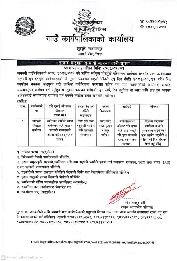 महिला कृषकहरुलाई दुग्धजन्य सामग्री उत्पादन तालिम कार्यक्रमको प्रस्ताव आह्वान सम्बन्धी जरुरी सुचना