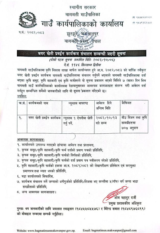 बगर खेति प्रवर्धन कार्यक्रम संचालन सम्बन्धी जरुरी सूचना (प्रकाशित मिति: २०८२/१०/०६)