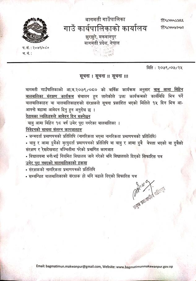 बाबु आमा विहिन बालबालिका संरक्षण कार्यक्रम सम्वन्धी सूचना ।