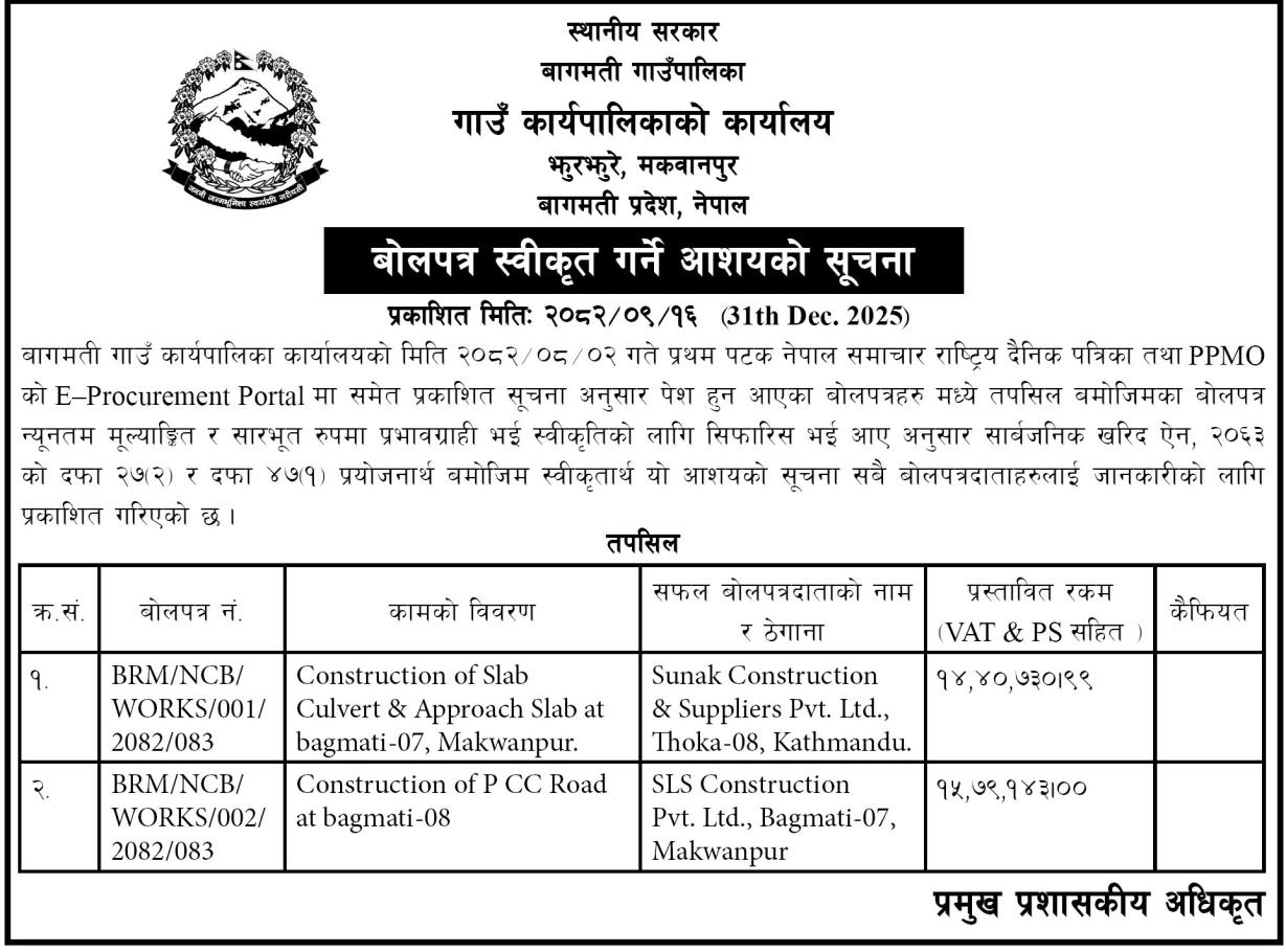 » बोलपत्र स्वीकृत गर्ने आशयको सूचना