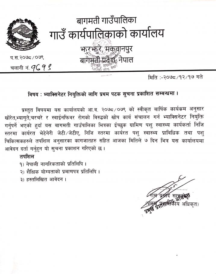 भ्याक्सिनेटर नियुक्तिको लागि प्रथम पटक सुचना प्रकाशित सम्वन्धमा ।