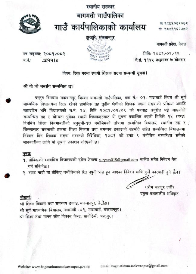 रिक्त पदमा स्थायी शिक्षक सरुवा सम्बन्धि सुचना।