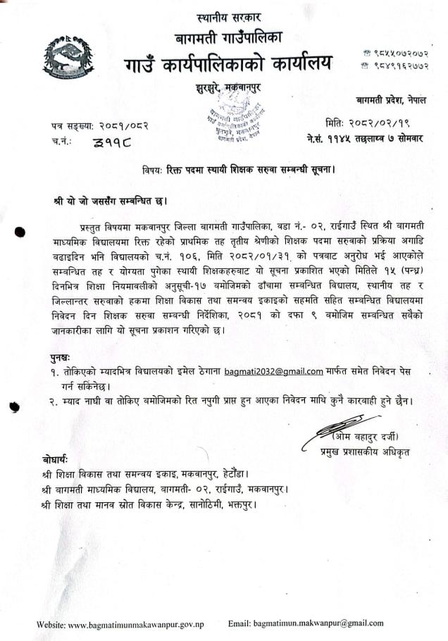 रिक्त पदमा स्थायी शिक्षक सरुवा सम्बन्धि सुचना।