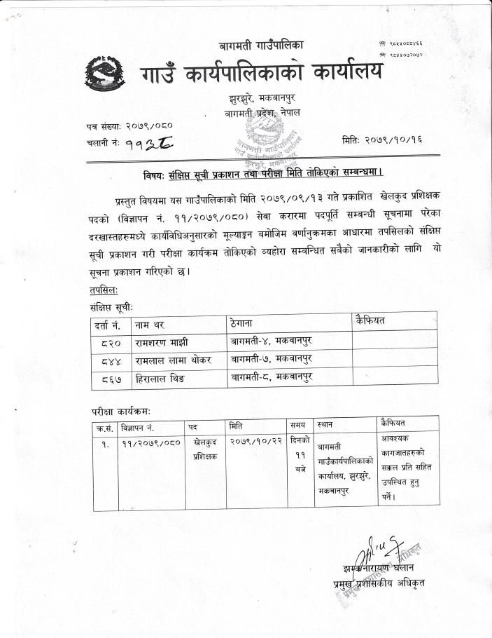 संक्षिप्त सूची प्रकाशन तथा परीक्षा मिति तोकिएको सम्बन्धी सूचना। (खेलकुद प्रशिक्षक)