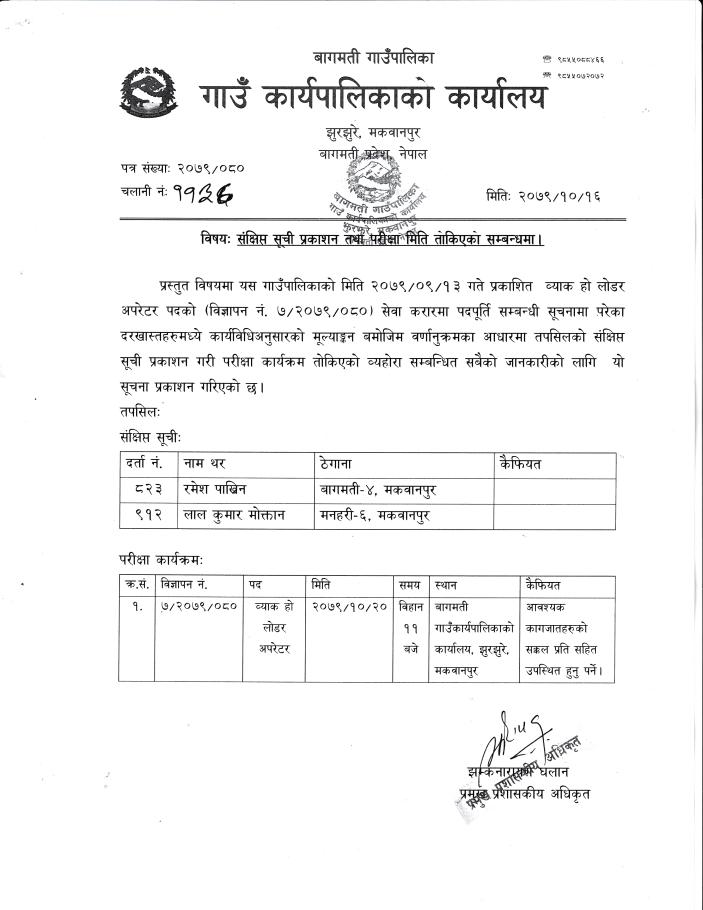 संक्षिप्त सूची प्रकाशन तथा परीक्षा मिति तोकिएको सम्बन्धी सूचना। (व्याकहो लोडर)