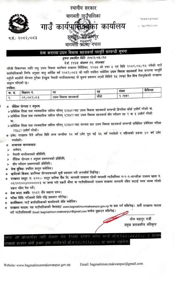 » सेवा करारमा उधम बिकास सहजकर्ता पदपूर्ति सम्बन्धी सूचना।
