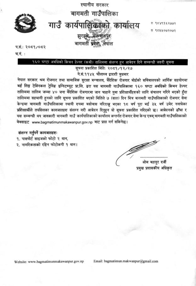» १६० घण्टा अवधिको किचन हेल्पर (कमी) तालिममा संलग्न हुन आवेदन दिने सम्बन्धी जरुरी सूचना