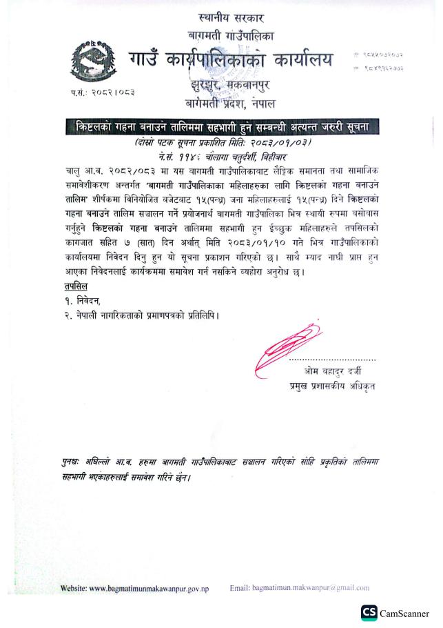 क्रिष्टलको गहना बनाउने तालिममा सहभागी हुने सम्बन्धी अत्यन्त जरुरी सूचना (दोस्रो पटक प्रकाशित)